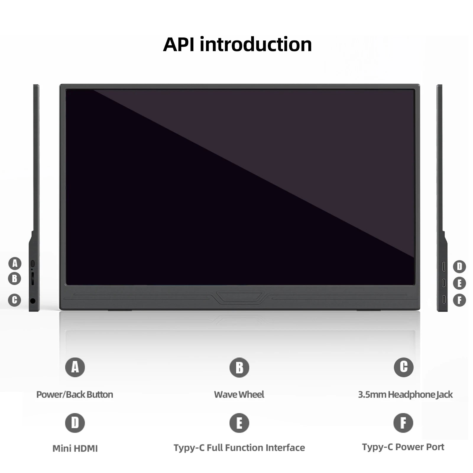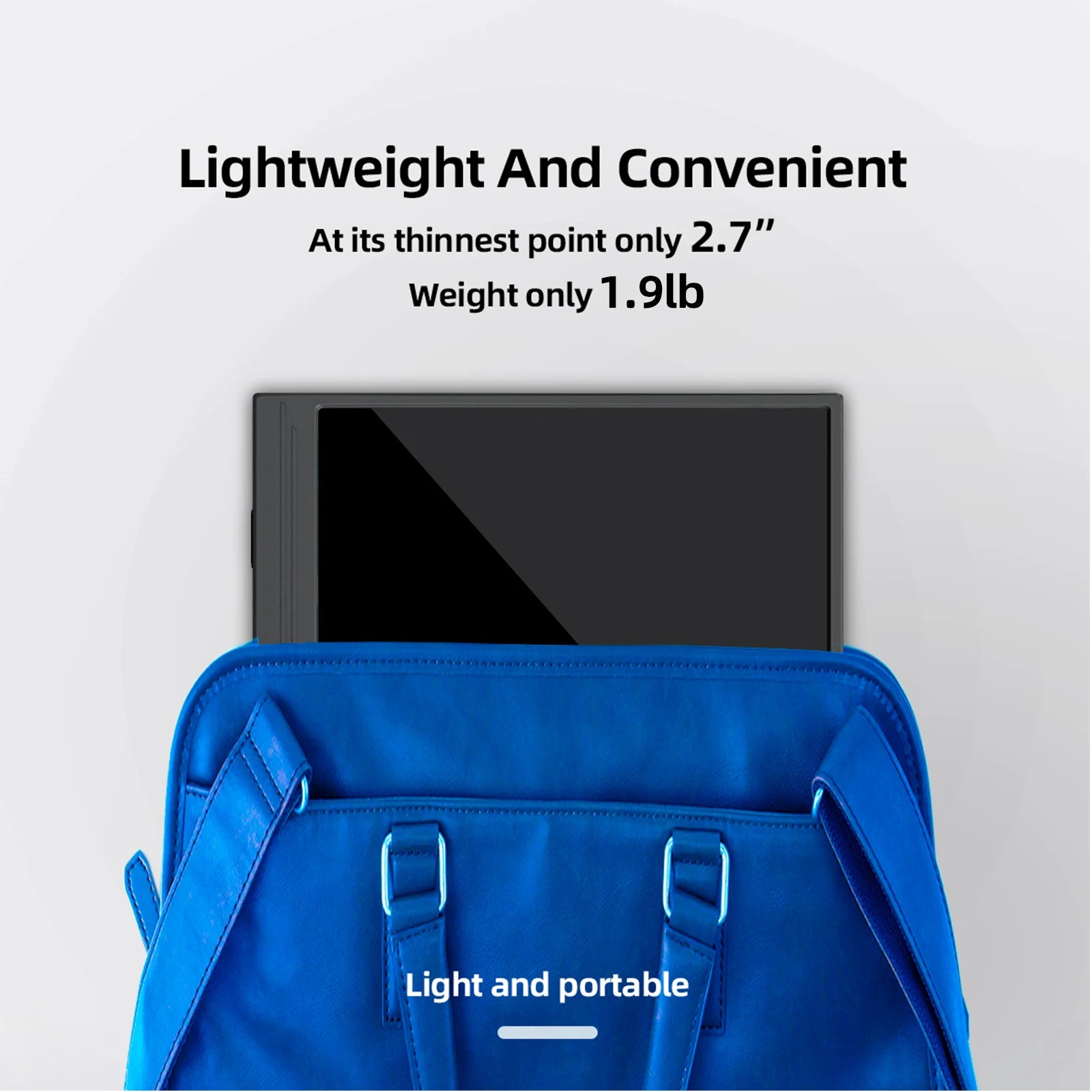 This 14-inch portable monitor features a 1920x1080 IPS display with 16:9 aspect ratio, 400cd/m² brightness, HDR10 support, and 60Hz refresh rate with AMD FreeSync Pro. It offers wide 178° viewing angles, two built-in speakers, and a matte screen surface. Available in standard and touch models, it is compatible with laptops, consoles, and mobile devices. The monitor comes with a magnetic leather case, screensaver membrane, HDMI and Type-C cables, USB cable, and adapter for convenient portability and use.