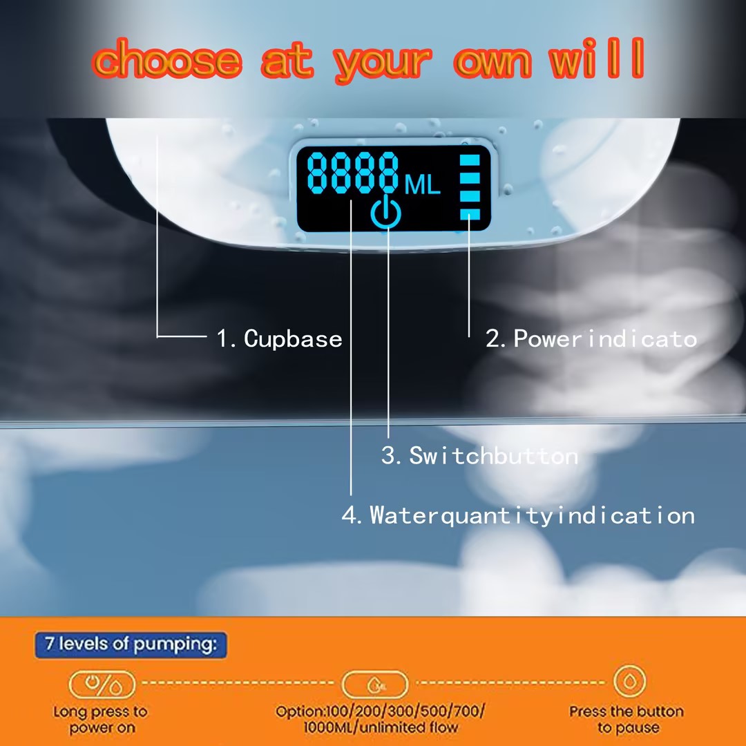 Smart with 8 levels of quantitative pumping, 8-stage capacity selection with indicator light (100ml, 200ml, 300ml, 500ml, 700ml, 1000ml, and unlimited flow), the electric water dispenser is suitable for various types of bottles (1~5 gallon).