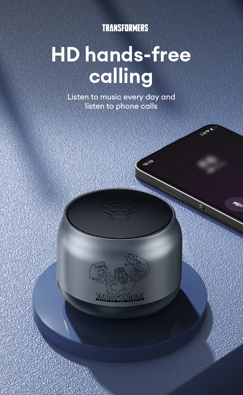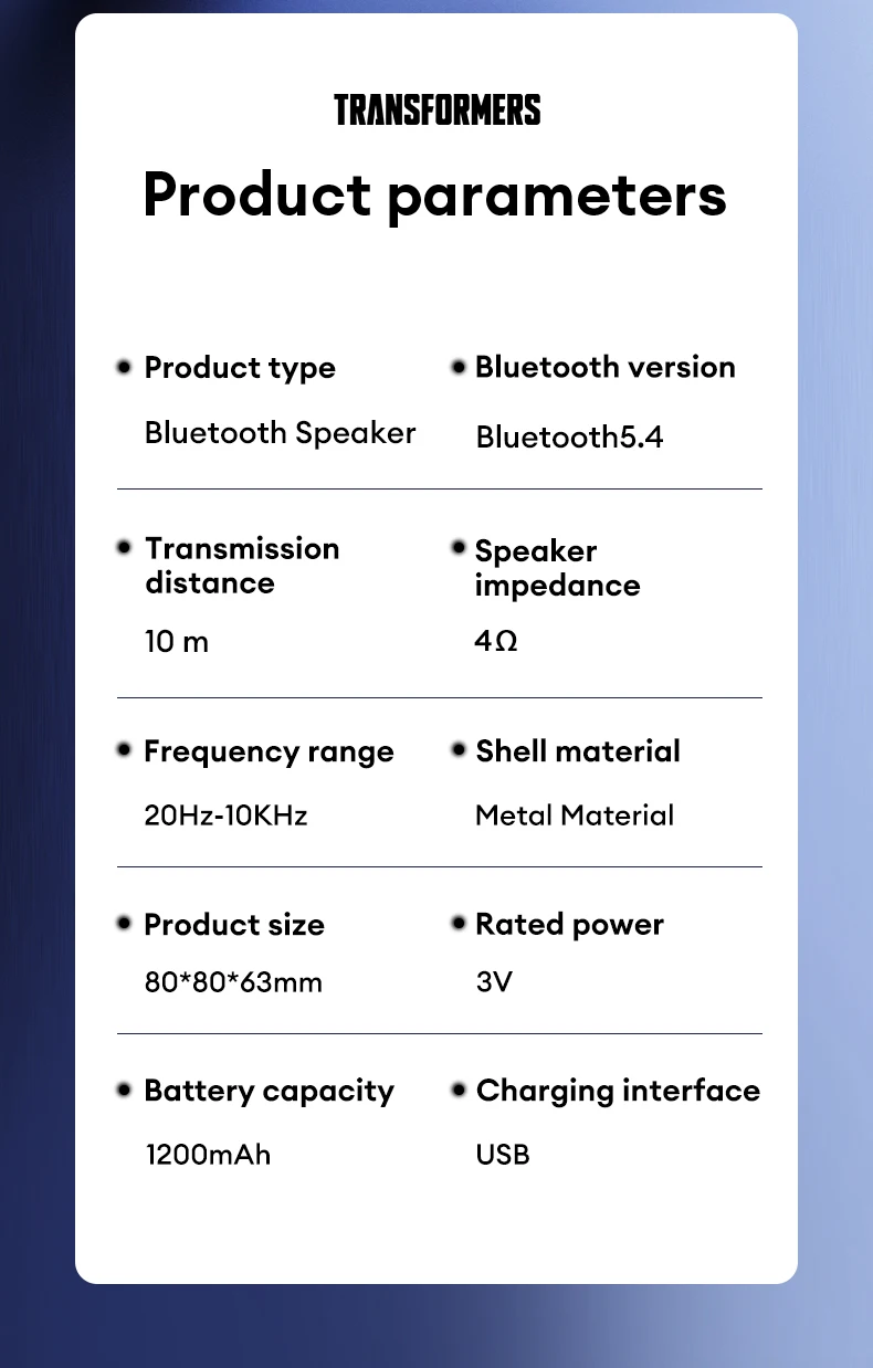 This portable speaker features a two-way audio crossover, a 1200mAh battery with about 3 hours of charging time, and Bluetooth version 5.4 connectivity. Branded as TRANSFORMERS, it has a plastic cabinet, a single channel, and 4-ohm impedance. With less than 25W input power and 3W output voltage, it offers 3EQ sound modes and a frequency response range of 20Hz to 10kHz. It’s designed for home use, has no voice control or app support, and is not waterproof. Available in black or silver gray, it has a wireless range of under 10 meters and comes without an adapter.