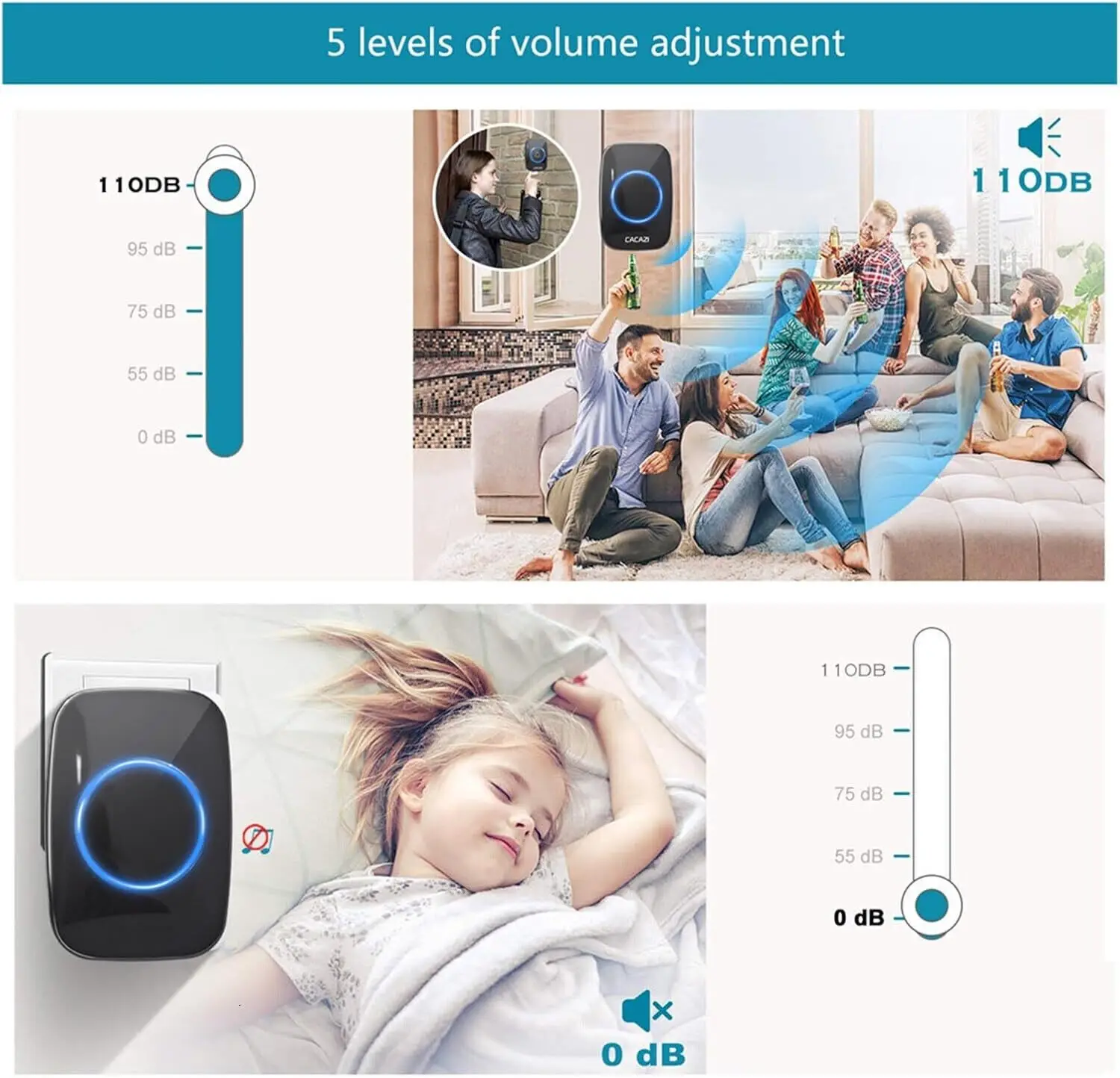 User-Friendly Features: The doorbell's memory function saves your settings even after power failure, while the blue LED light alerts hearing-impaired users.,Waterproof Design: Equipped with an IP55 waterproof rating, this doorbell is designed to withstand various weather conditions, making it suitable for all seasons.,Customizable Ringtone: Choose from 58 ringtone options and assign different melodies to different recipients, personalizing your doorbell experience.,Long Battery Life: Operated by 23A 12V alkaline batteries, this doorbell boasts an impressive lifespan of up to three years, reducing replacement frequency.,High Volume Range: With a 5-stage adjustable volume of 0-115 dB, this doorbell ensures you never miss a visitor, even in noisy environments.